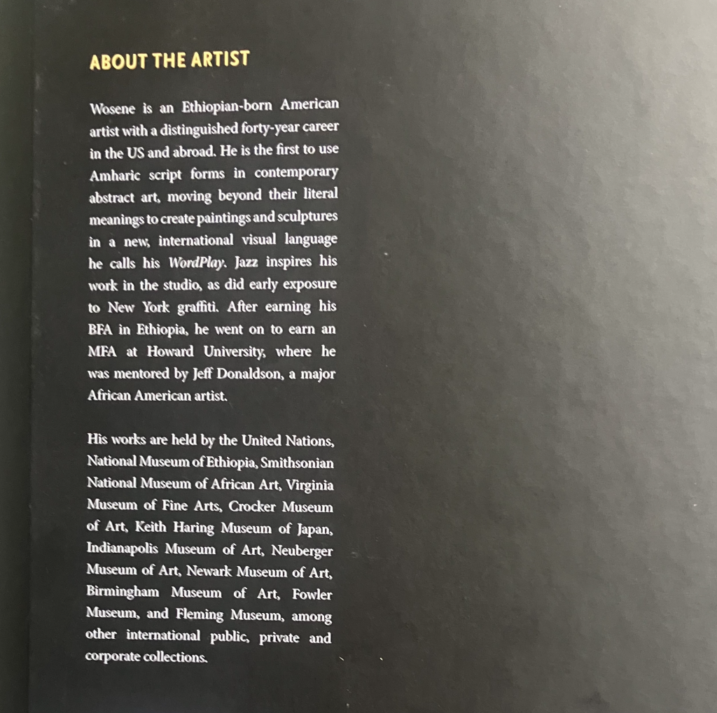 ウォセネはエチオピア生まれのアメリカ人アーティストで、アメリカ国内および海外で40年以上にわたる輝かしい経歴を持っています。彼は現代抽象芸術において初めてアムハラ語の文字を使用した人物であり、文字の文字通りの意味を超えて、新たな国際的ビジュアル言語を創造し、絵画や彫刻を制作しています。彼はこれを「WordPlay(ワードプレイ)」と呼んでいます。ジャズは彼の制作活動に大きな影響を与えており、またニューヨークのグラフィティ(落書き)に幼少期から触れたことも影響しています。エチオピアで学士号(BFA)を取得した後、ハワード大学で修士号(MFA)を取得し、アフリカ系アメリカ人の著名なアーティストであるジェフ・ドナルドソンの指導を受けました。